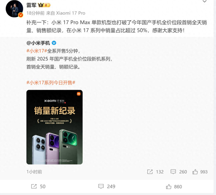 雷军表示:补充一下:小米 17 Pro Max 单款机型也打破了今年国产手机全价位段首销全天销量、销售额纪录,在小米 17 系列中销量占比超过 50%,感谢大家支持!